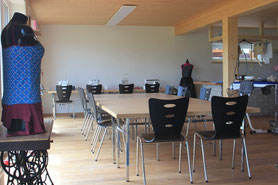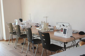 Zum Arbeiten steht uns ein toller Raum mit viel Licht und großen Tischen zur Verfügung. Außerdem ein Zuschnitttisch und eine Bügelstation.